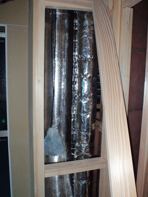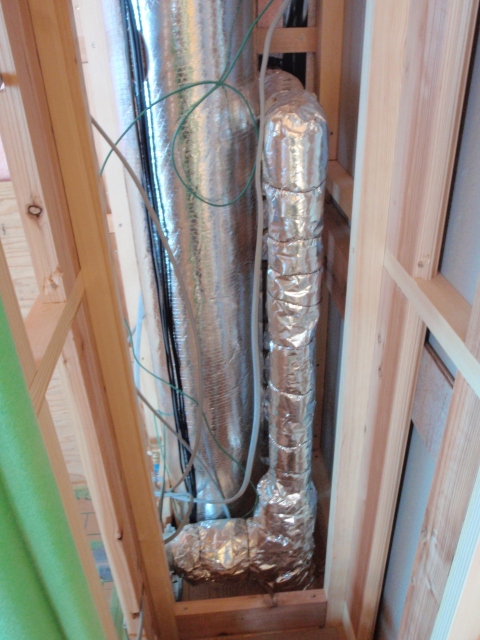 1Fの勝手口わきのパイプスペース。排水管は結露対策だろうか?保温材で巻かれていました。
