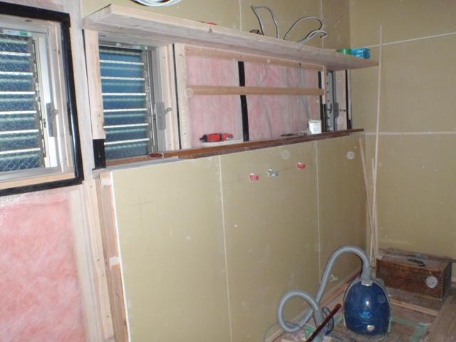 キッチンの背面の壁。一部分石膏ボードがないのは棚部分かな。造作の棚をここに取り付ける予定です。