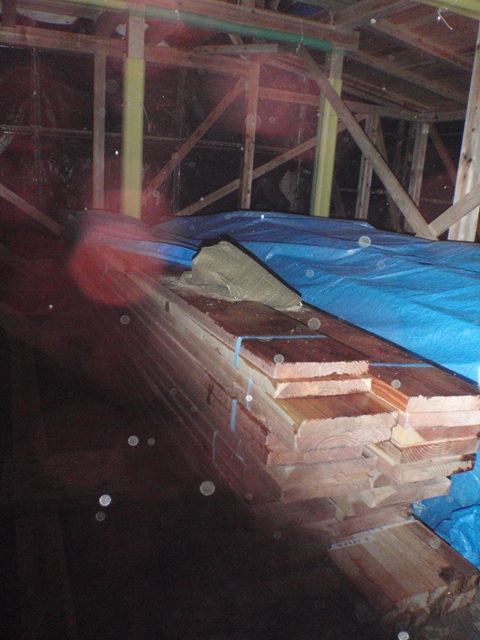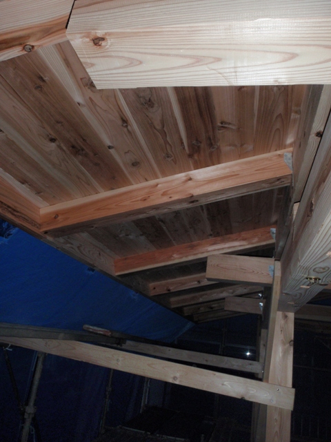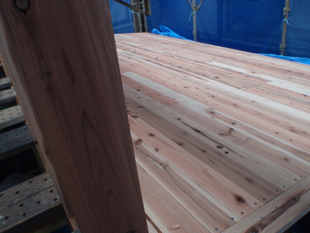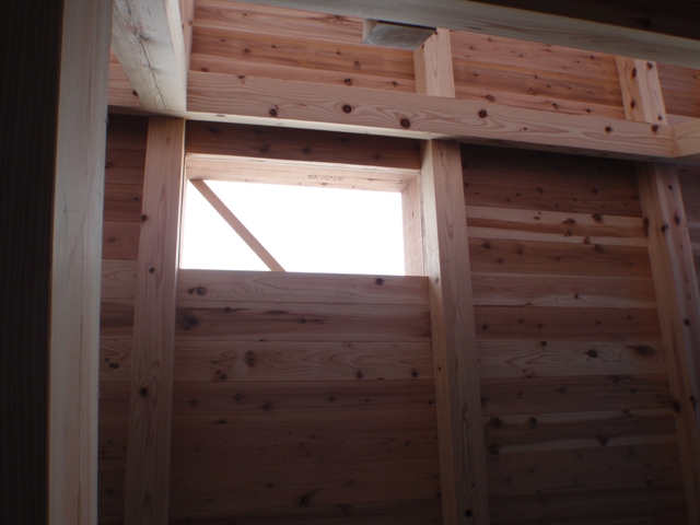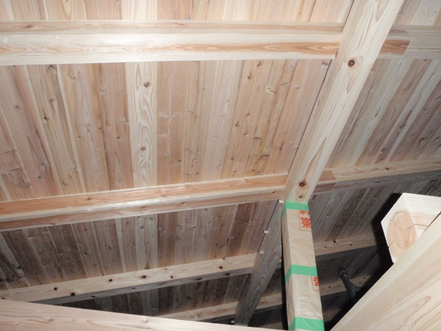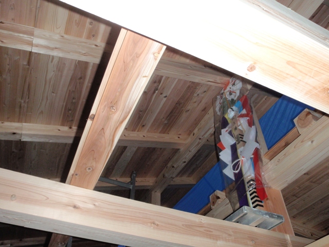 東側の野地板だけの状態。もし、室内の床板を八溝杉の選択をしていたらこんな雰囲気になっていたのかも。
