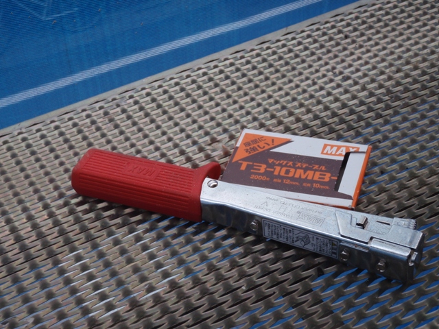 これでバシバシと止めていました。このシートはツルツル滑るらしくて大工さんたちも滑る滑ると言ってましたよ。