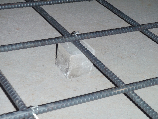 捨てコンと配筋の間は、このようなコンクリートのブロックが置いてあり、配筋自体を浮かせています。