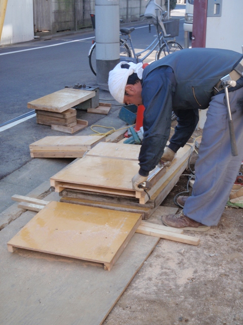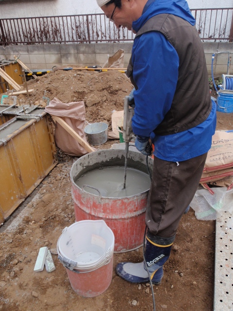 天端レベラー用のとろとろのコンクリート液を作り、型枠に流し込んでいます。あらかじめ基礎に売ってあった釘で水平を保ちつつレベラー材を流し込み。