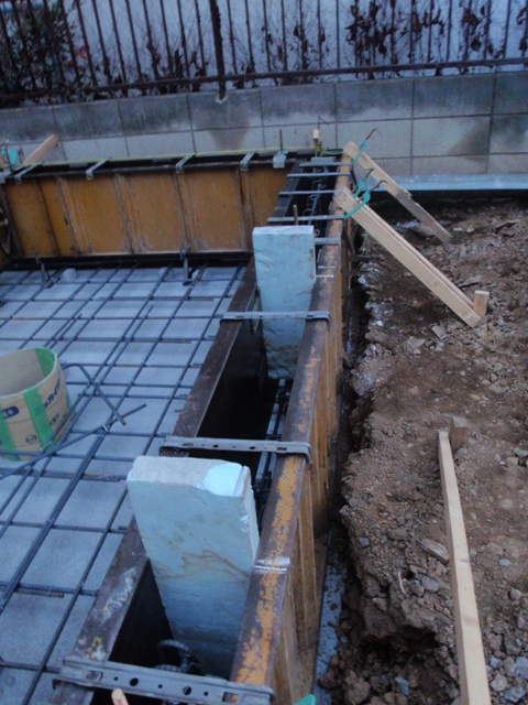 玄関になるところは、基礎の立ち上がり部分が低くなるので発泡スチロールで仕切ってある。