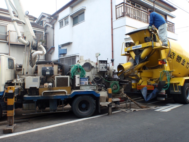 コンクリートミキサー車から、コンクリートポンプ車にコンクリートが流し込まれます。