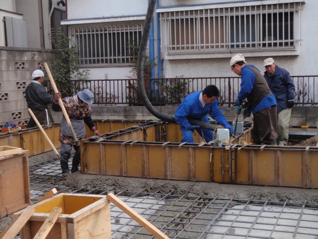 先ずは型枠の中に流し込んでいくんだけど、共同作業でドンドン進んでいきます。コンクリートを流し込みながら、バイブレーターで隅々までいきわたらせたり、木材でつついたりしています。