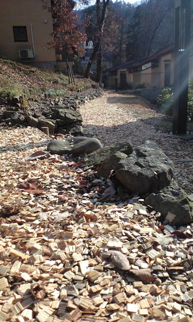 コテージ前の小径にはウッドチップが敷かれていて、これも製材所から出たものなんだろうなーと思いを馳せてみました。