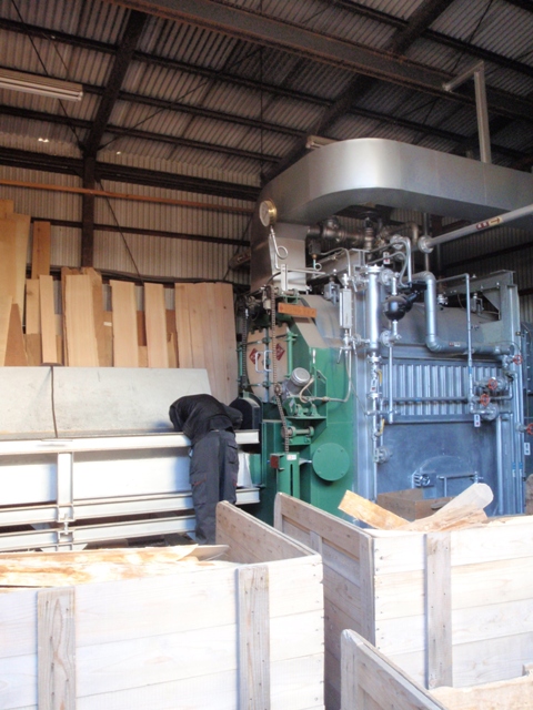 沖倉製材所では、製材の際に出た、端材やら、剥いた木の皮を燃料にして乾燥器の熱源に使っているのだ。これは、その端材を燃やして蒸気を発生させる機械。