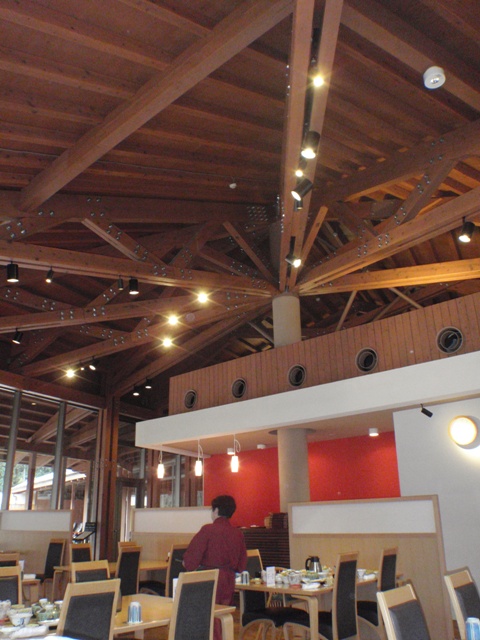 レストランはダイナミックに木材をあらわしてます。温泉も気持ちいい空間でした。
