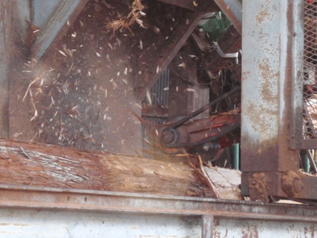 先ほどの原木市場で仕入れた丸太は、機械にかけて樹皮を剥く