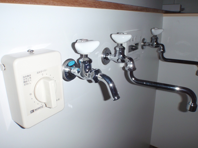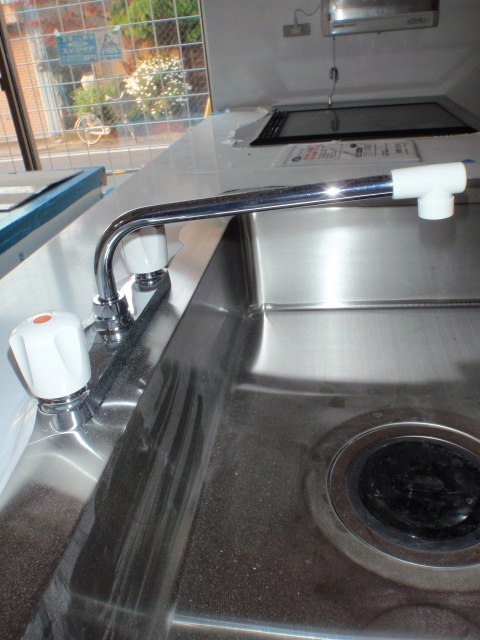 キッチンにもいよいよ水洗金具が付いていた。