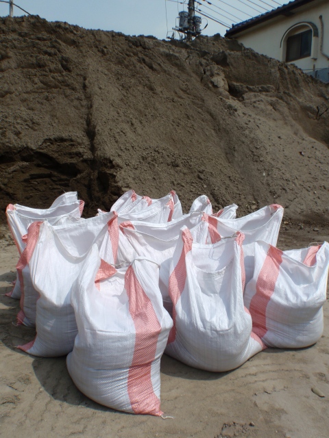 この赤土の山からショベルで土のう袋に自ら詰めます。