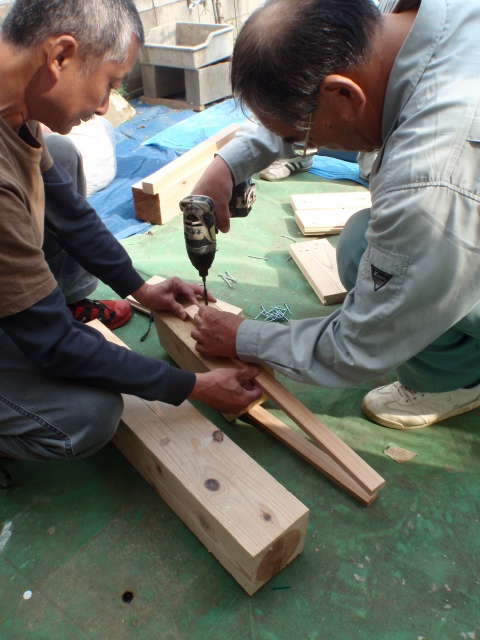 現場では安田さんと現場監督の福留さんが、タタキに使う道具を作成してくれました。