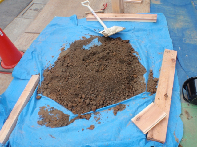時間も夕刻にさしかかっていたので、テスト的に赤土と山砂を1袋ずつ混ぜ合わせ、
