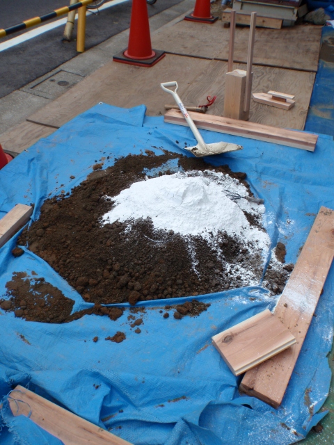 ここまで混ぜ合わせたうえで、次は消石灰を混ぜていくんだけど、これまた加減が難しい。