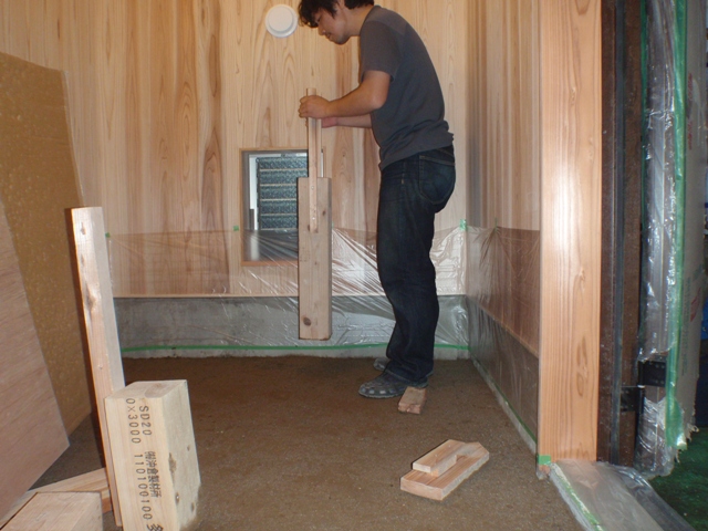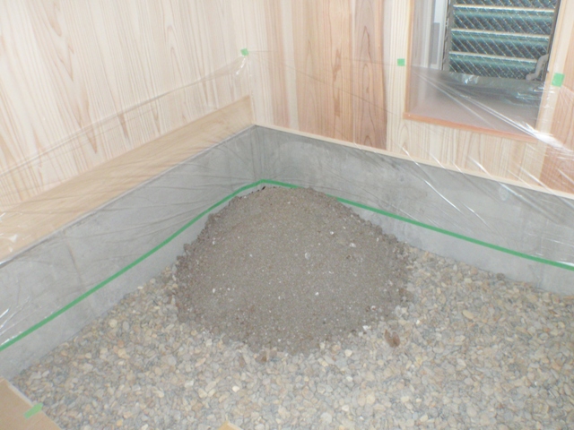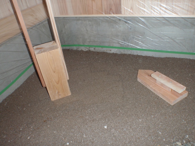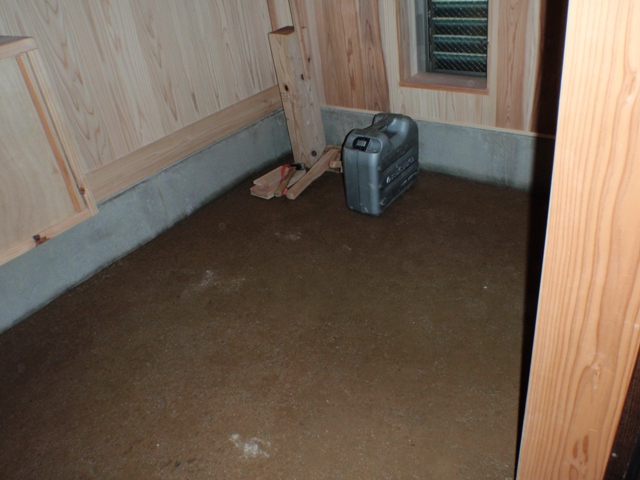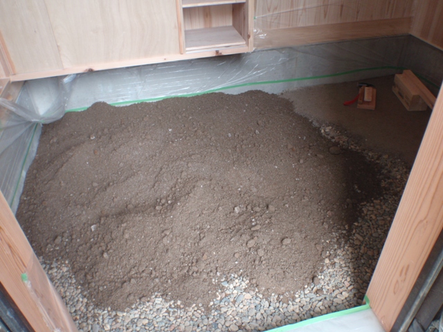 にがりも混ぜた土を早速、土間に搬入。均してたたいてみました。