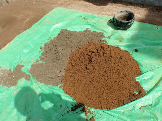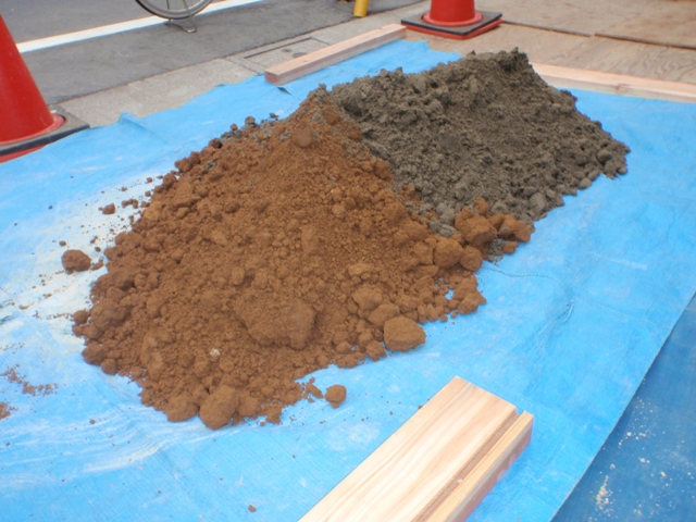 手前が赤土、奥が山砂。